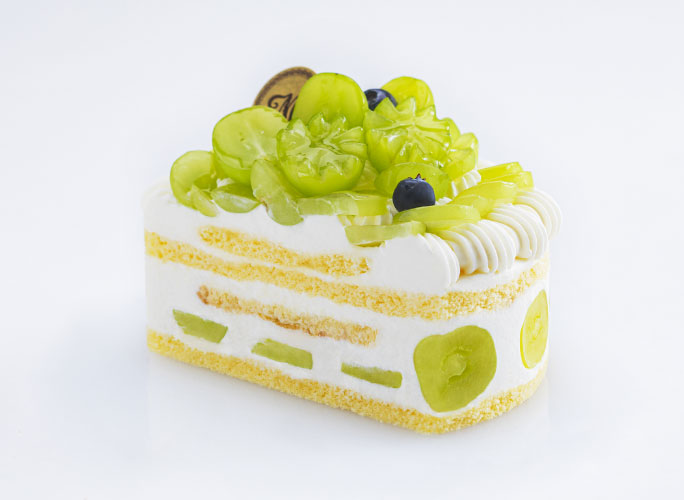 ふわふわのスポンジとなめらかなホイップを重ねたショートケーキにみずみずしいシャインマスカットをたっぷりと飾りました。
