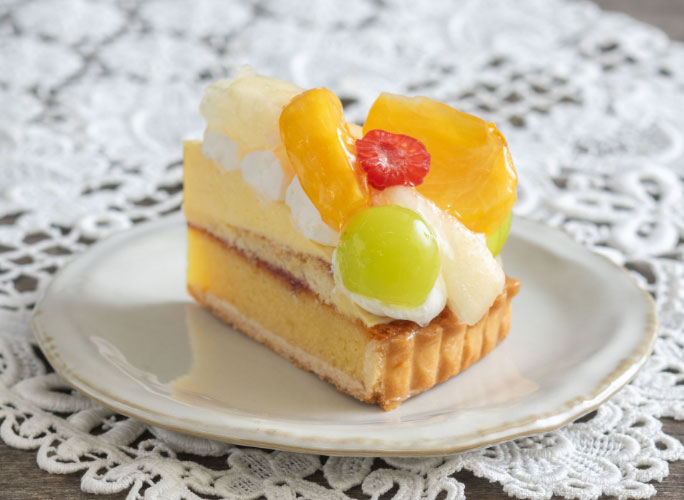 カスタードクリームと香ばしいアーモンドタルトに旬のラ・フランス、シャインマスカット、柿を合わせました。